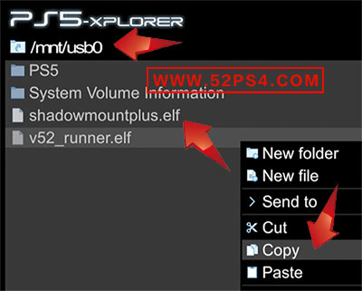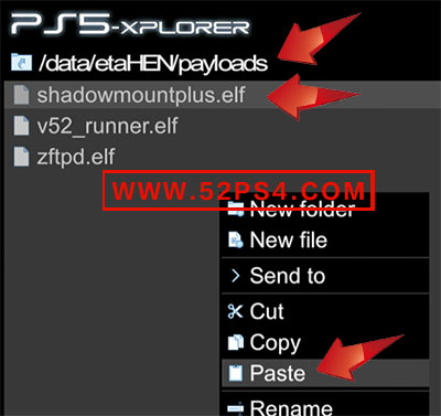 4、找到《/data/etaHEN/payloads/》目录,点击手柄《三角键》选择《Paste》,点击手柄《X键》粘贴进去。